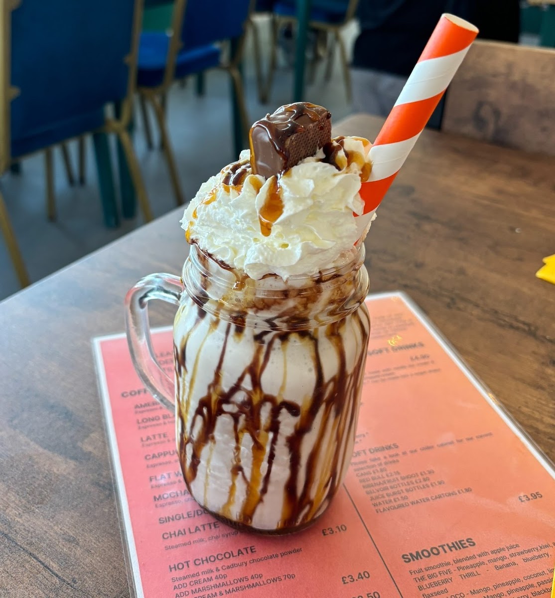 Weymouth Bay Coffee Co’s coffee offering is a highlight, drawing in coffee lovers with well-prepared lattes (oat milk options included) and inventive shakes like the Crunchie bar milkshake for something more indulgent. The presence of treats such as rainbow cake and coffee cake pairs well with the drinks, making it a fitting spot to catch up over something sweet after a walk or before heading to local attractions like Sandworld or the food festival nearby.